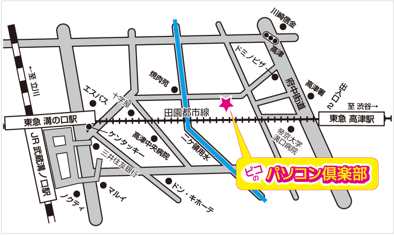 パソコン倶楽部溝の口は JR南武線 武蔵溝ノ口駅より徒歩7分 東急田園都市線・大井町線 溝の口駅より徒歩6分、高津駅より徒歩3分 の場所にあります。